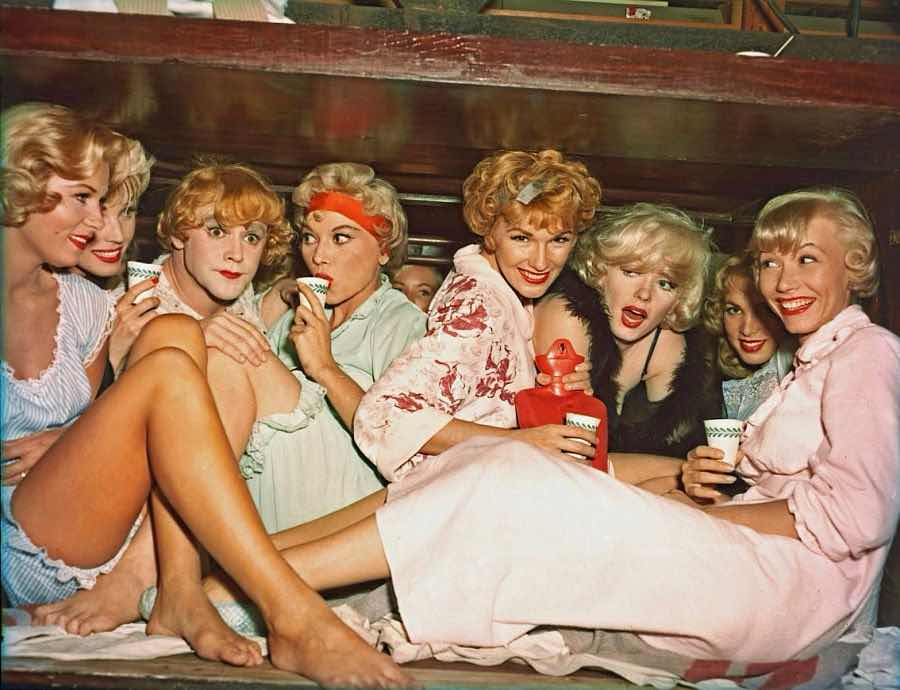 Wilder volvió a trabajar con Marilyn tras su encuentro en “ La tentación vive arriba” ( 1955 ) y la relación entre ambos fue muy conflictiva debido a los olvidos de diálogos continuos de la diva que no atravesaba además un buen momento personal. Todo ello no obstante no se demuestra en la pantalla y la actriz borda su típico personaje de rubia con pocas luces y buen corazón, además de trasmitir sensualidad y enamorar a la cámara. Como pareja de la rubia actriz, un Tony Curtis en el mejor momento de su carrera con su habitual personaje de tipo seductor, liante y encantador. La película supuso la primera colaboración entre Wilder y su futuro actor fetiche Lemmon ( trabajaría en un total de 7 películas , tres de ellas con Walter Matthau ) La alocada interpretación del actor, sus divertidos piques con Curtis y su química con Joe Brown con el que protagoniza quizá el final cómico más famoso de la historia ( “ Bueno…nadie es perfecto “ ) es sin duda lo mejor de la película.